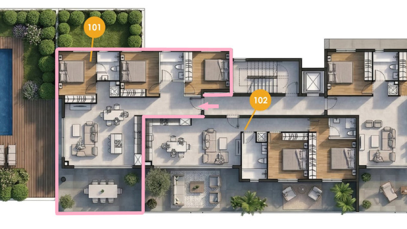This spacious 3 bed ground flat offers an internal area of 100 m², perfectly designed for luxury living. The main living area opens out onto a private yard with a stunning swimming pool, providing an ideal space for relaxation or entertaining guests. An additional public swimming pool and a public gym further enhance the lifestyle appeal of this home by providing resort like amenities!