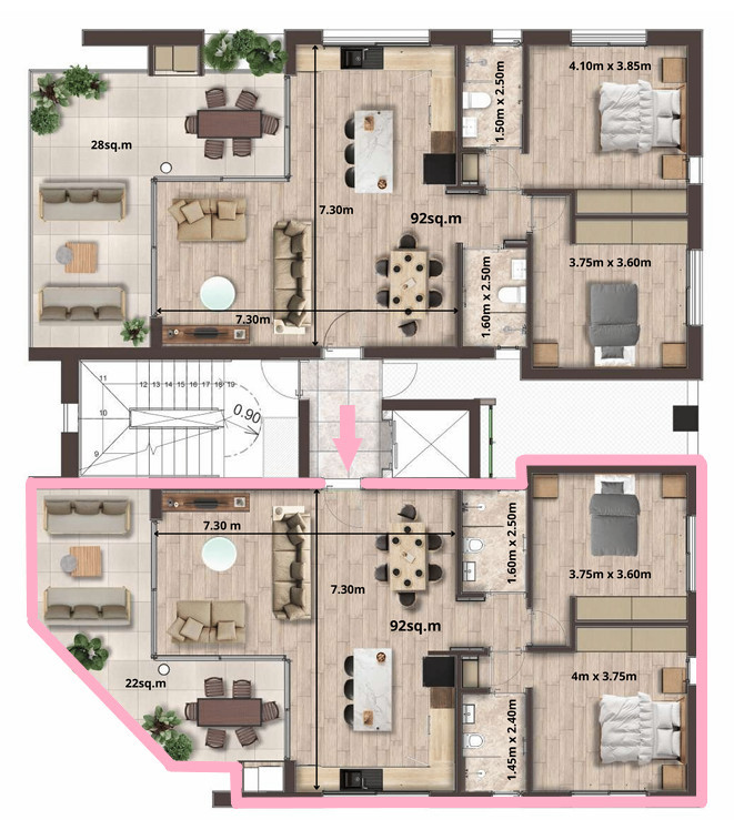 A modern two bedroom flat in Strovolos, situated on the top floor of a four storey building. The flat features two spacious bedrooms, two stylish bathrooms, and an open plan layout with large windows offering panoramic views.